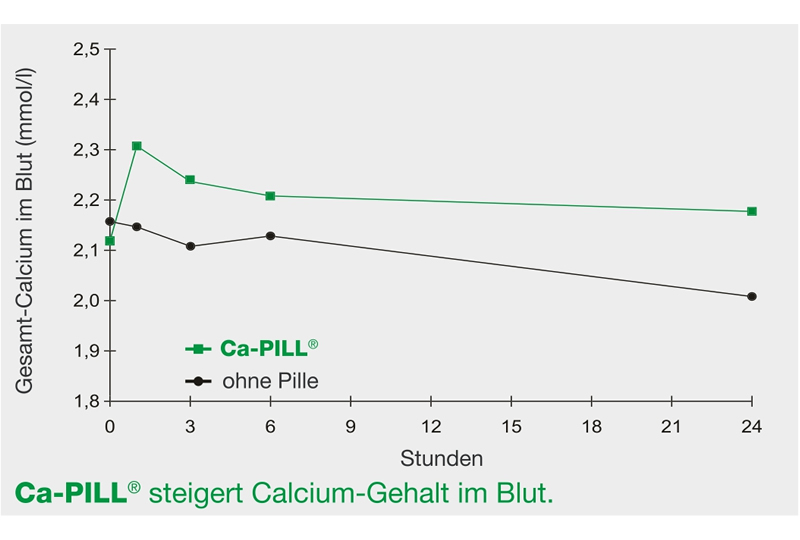 Wissenschaftliche Prüfungen haben gezeigt, dass die Ca-PILL® den Calciumgehalt im Blut von 1 bis 24 Stunden nach Gabe erhöht.