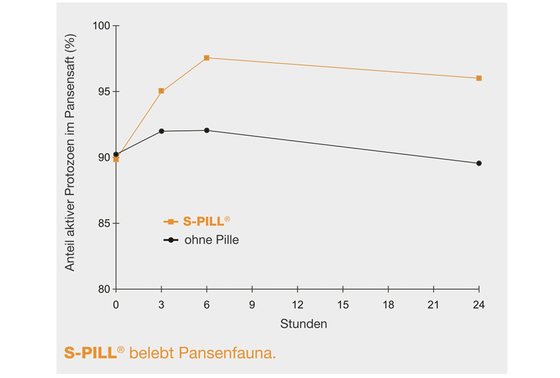 Wissenschaftliche Prüfungen haben gezeigt, dass die S-PILL® die Pansenflora und -fauna bis 24 Stunden nach Gabe belebt und Energie zuführt.