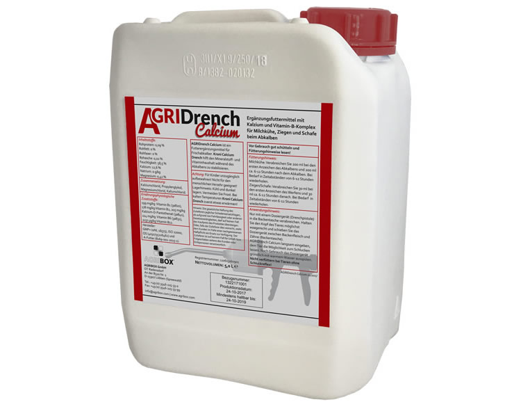 AGRIDrench Calcium ist ein flüssiges Futterergänzungsmittel für Wiederkäuer, welches speziell entwickelt wurde, um den Mineral- und Vitamin-Haushalt rund um das Abkalben zu stabilisieren. AGRIDrench Calcium enthält eine schnell verfügbare Form von Kalzium. Es gelangt direkt in den Labmagen und stabilisiert den Blut-Kalzium-Gehalt innerhalb von 15 Minuten. So wird das Risiko auf Kalziummangel (Ursache für Milchfieber) nach dem Abkalben schnell und einfach minimiert.
